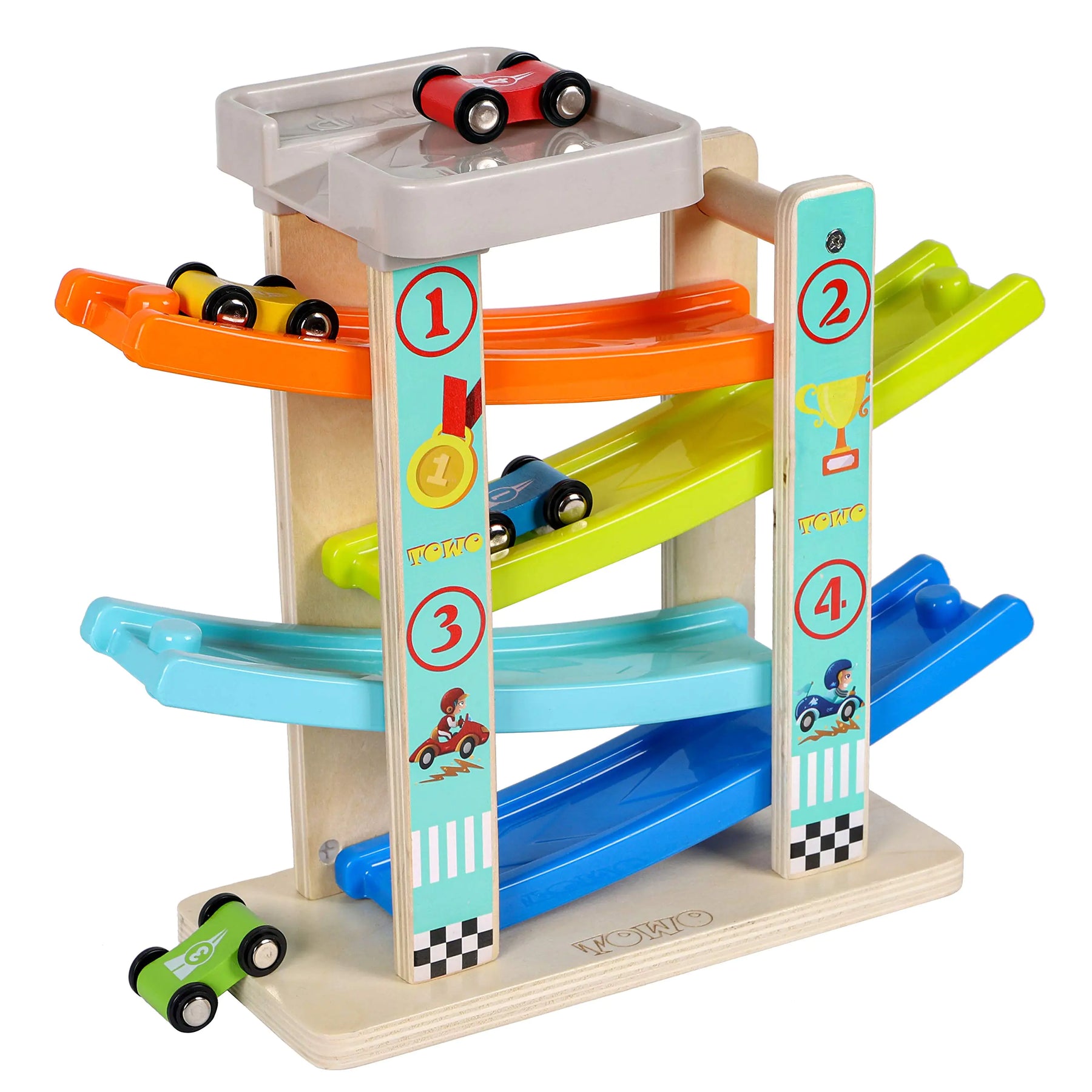 Wooden car zig zag slide with ramp tracks 4 cars and roof top car park. This is the best wooden car toy for toddler boys and girls. With the car park on top this car park playset is unique and different from other wooden car racer toys. It is easy to set up and fun to play. It is suitable for children of 18 months and over. Set the car off on the top track and watch it sliding down level by level to the bottom track. It can be played by one child or more children by taking turns. It is robust and easy to play and brings endless fun to young children. Great wooden car toy for toddlers."Toys of Wood Oxford" or "TOWO" is known for its fine quality design led traditional fun and educational wooden toys. Toys include wooden puzzles sorting stacking s pull-along Montessori learning matching building and construction toys family games and wooden brain teaser puzzles etc. are exclusively on Amazon. Wooden toys made with pure love and care for our children and the environment. All of the products meet the criteria set by the EC Toy Safety Directive ASTM F963 and CPSIA Standards tested and certified by International Accredited Labs. We pride ourselves on providing best and safe wooden toys and first class customer services. We hope our products will bring lots of fun and enjoyment to your children and family.